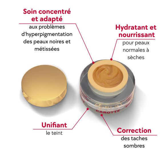 - Huile de carotte : riche en vitamine A, l’huile de carotte est traditionnellement utilisée par les femmes africaines et métissées pour conserver un teint uniforme et lumineux.